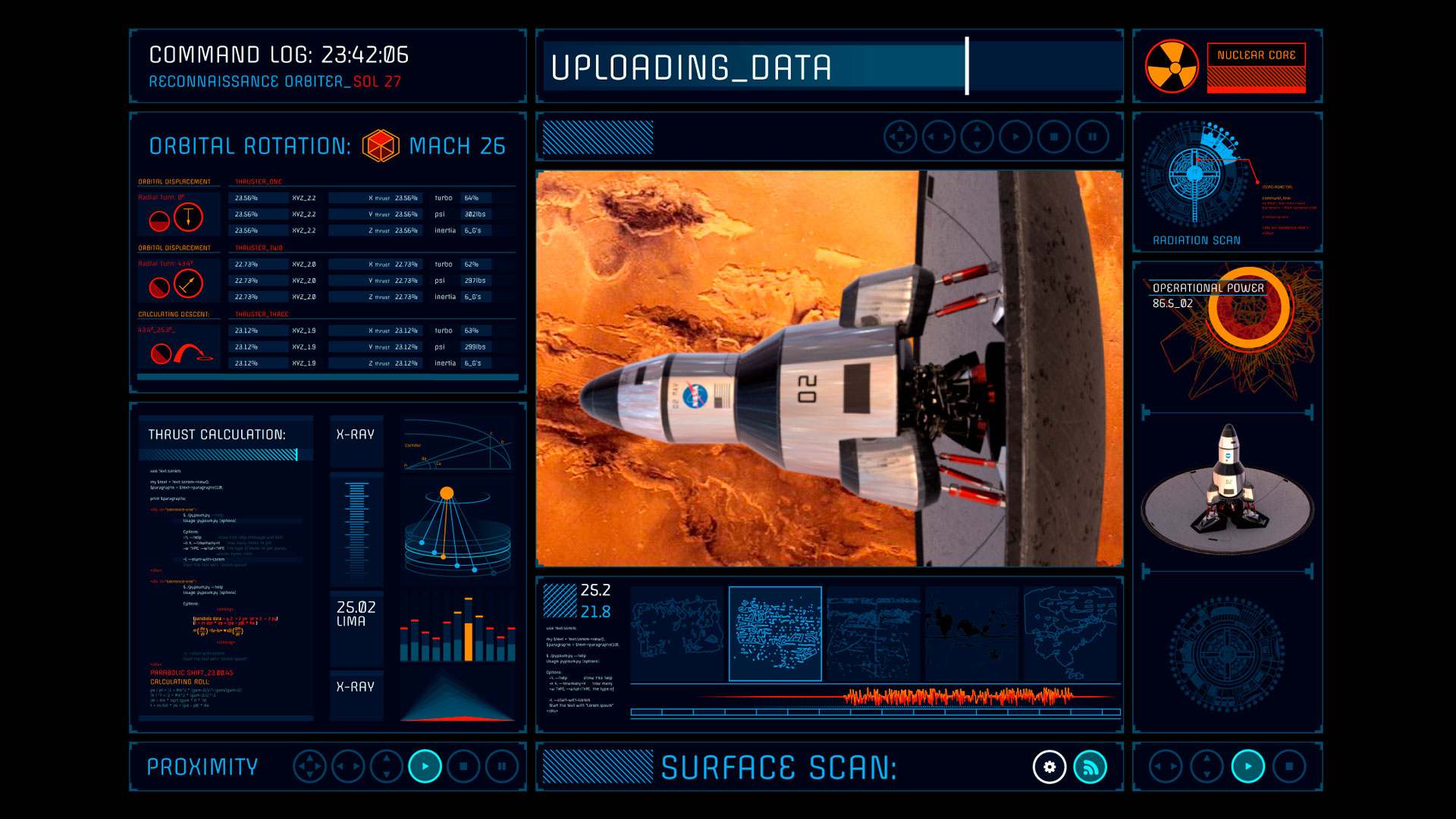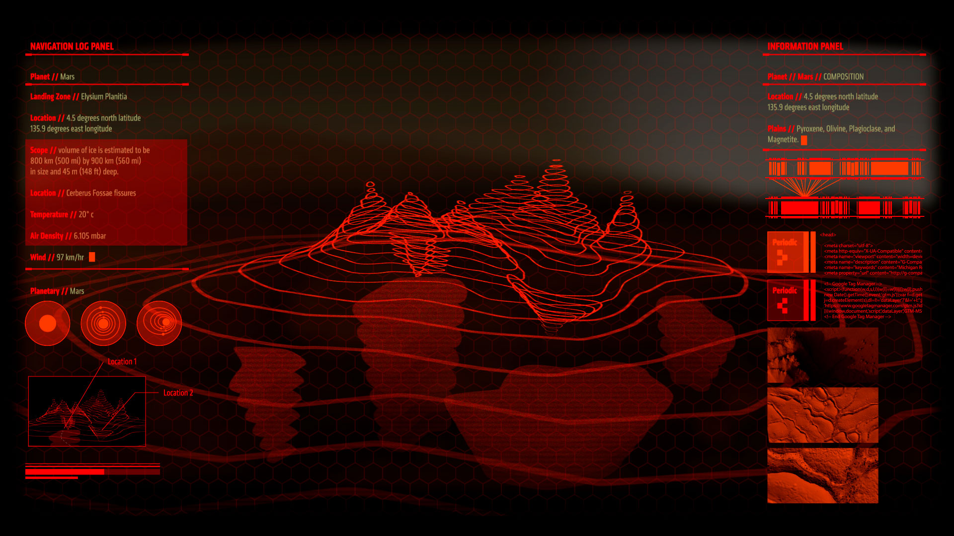 Here I'm paying homage to "Data Design" and the great sci-fi designers before me and allowing their creative pipeline to influence mine. While focusing on Mars as a narrative it offers a lot of rich ideas to generate even more content. Space travel and science fiction have held my attention since I was a little kid so it seems like a natural place to land and explore. From concept drawings, to Photoshop and Illustrator, to Maya, and post production After Effects here is where we get to have some fun.